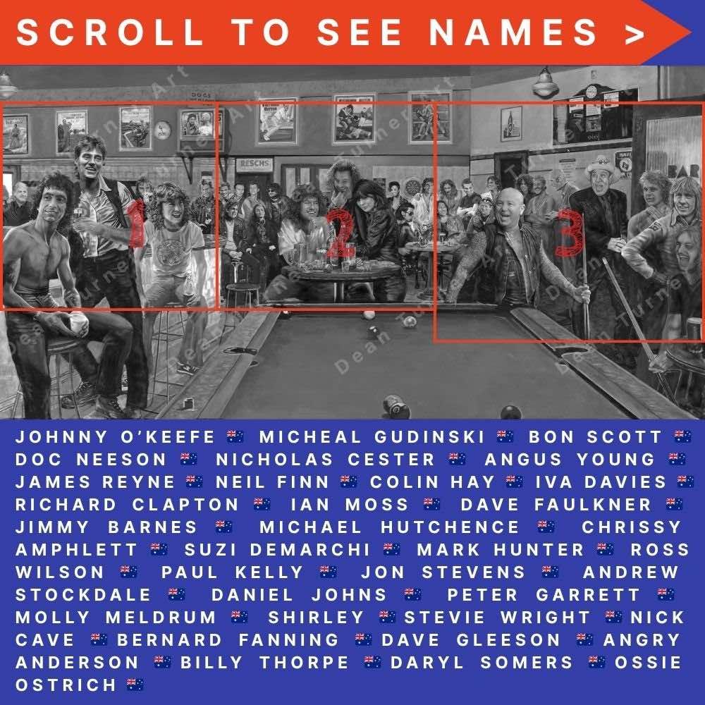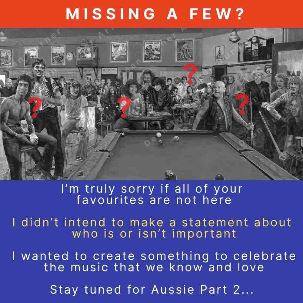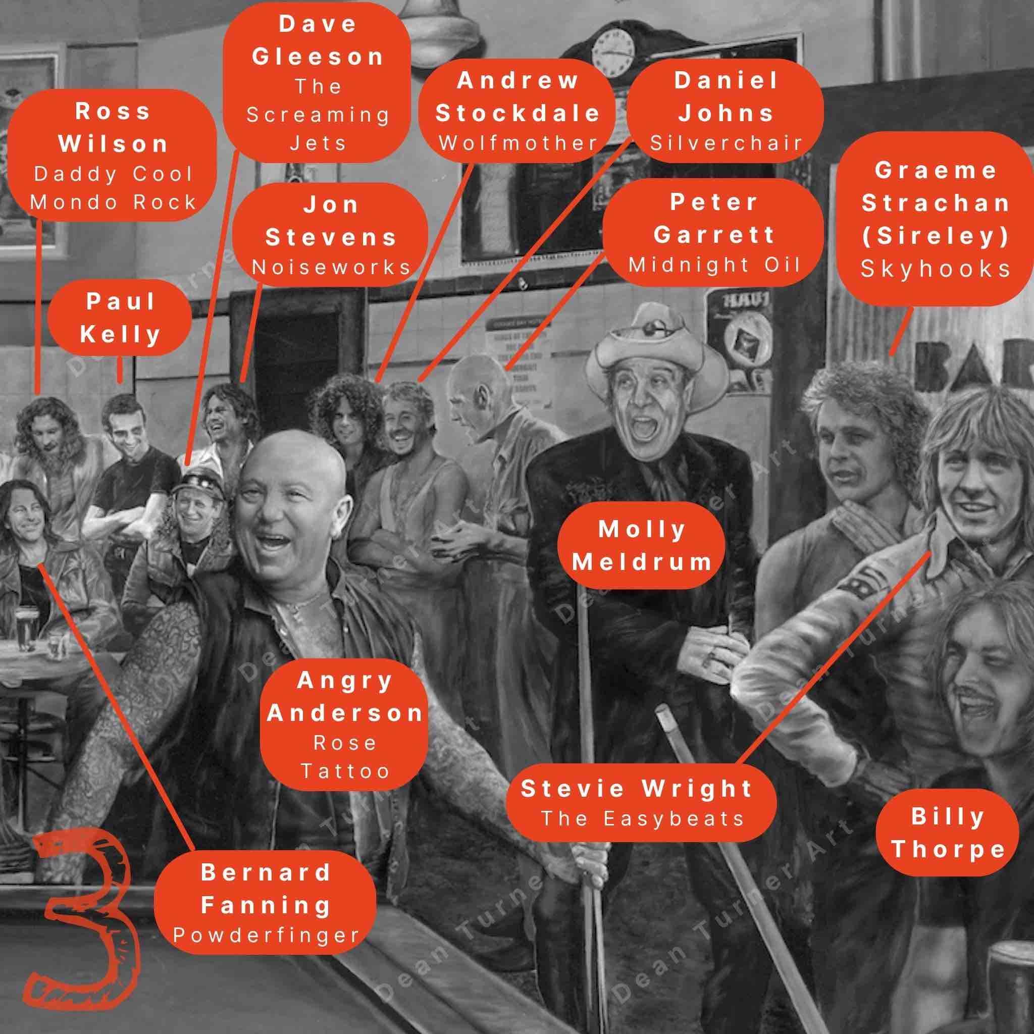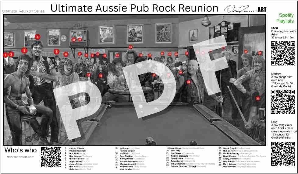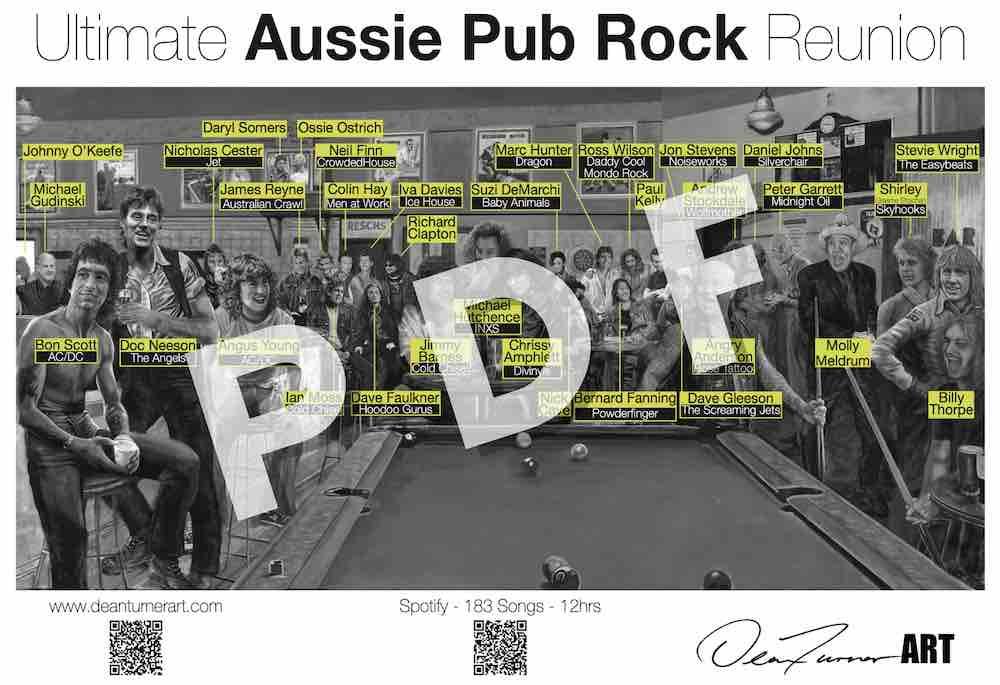 Short - 1 song from each named artist in this painting - 35 songs, 2 hours 15 mins of Aussie pub rock music