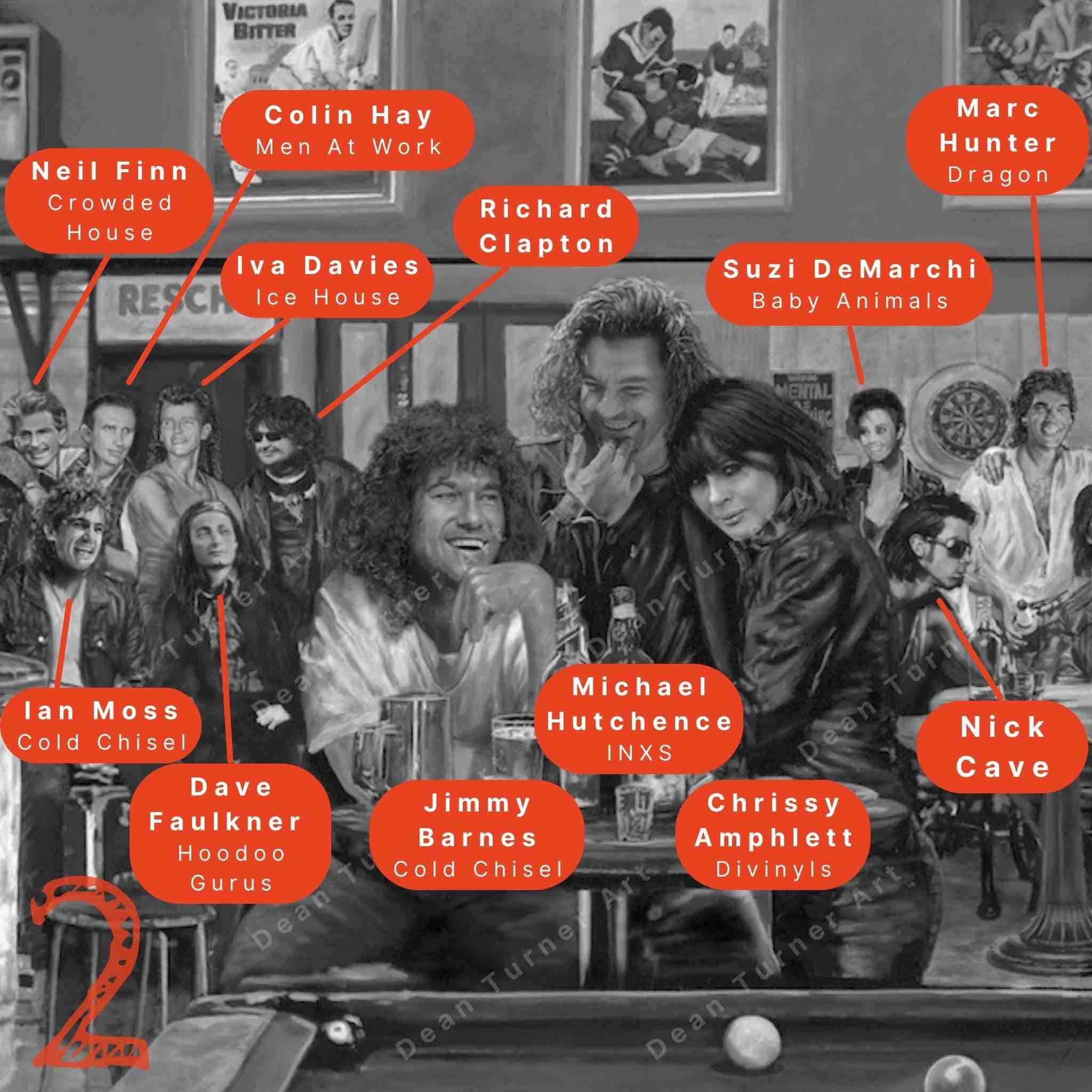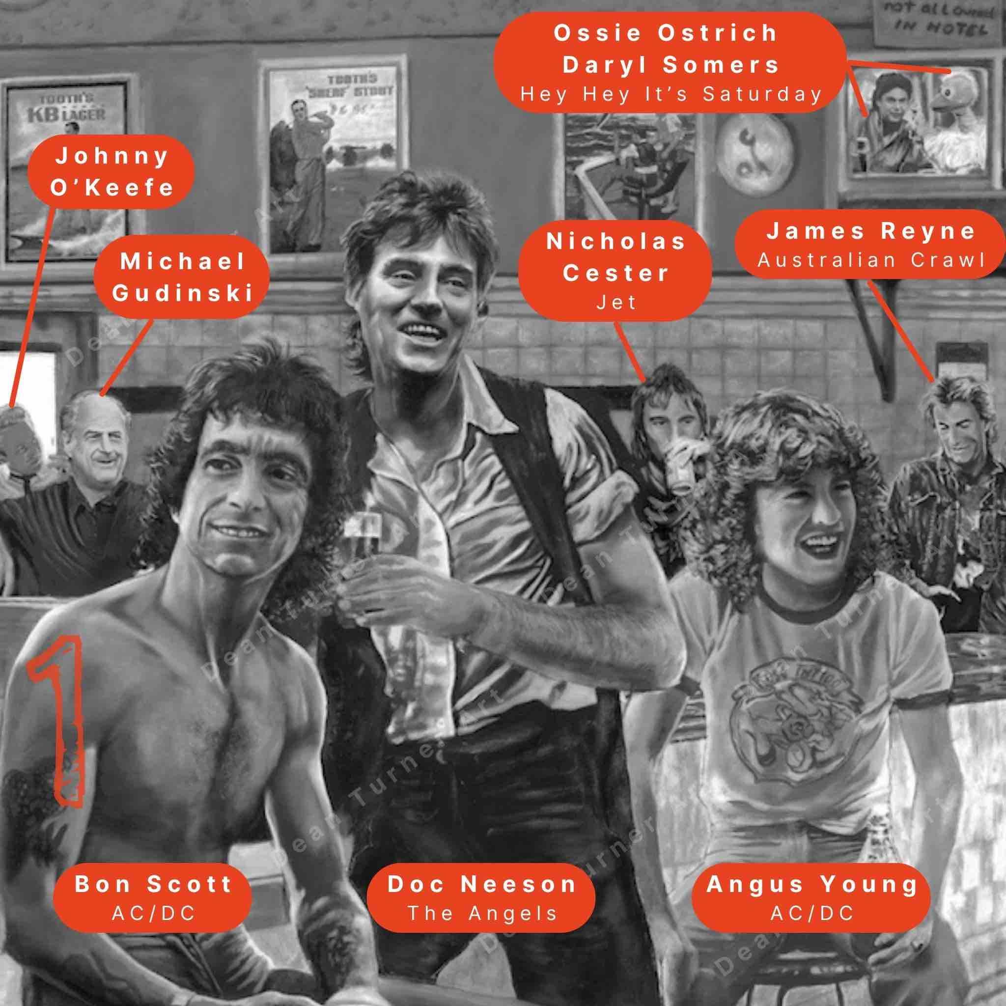 As always with Deans work, there are plenty of great names missing from this scene. It's impossible to fit everyone in. Just imagine they were at the bar ordering a drink, slipping out for a wiz, or getting into some sort of strife... they were here, but not 'in the shot' It won't be long though. Dean is mulling over Aussie II - so watch this space for more of your favourites.