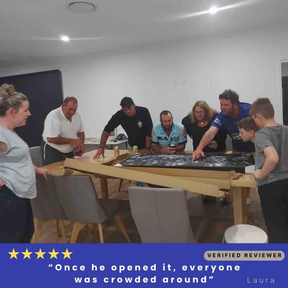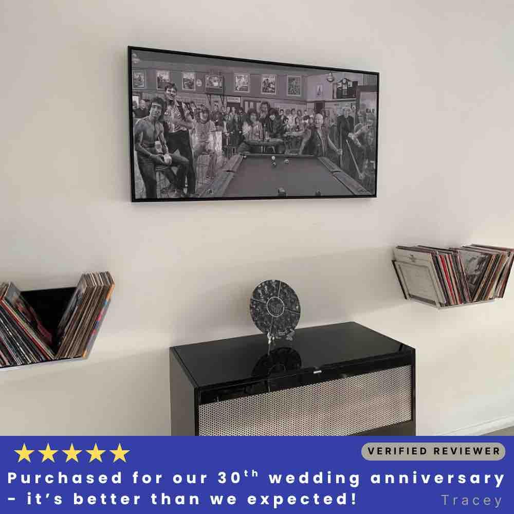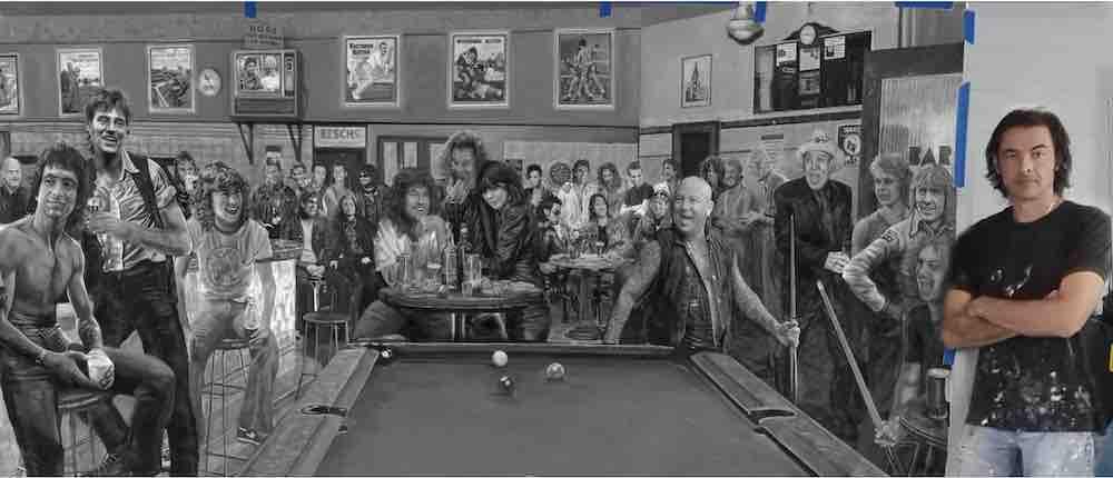 Dean worked on this painting for well over a year and completed it in 2024. See the image of Dean standing next to the original below - it's massive! The hardest thing to do is fit everyone in (It always is).