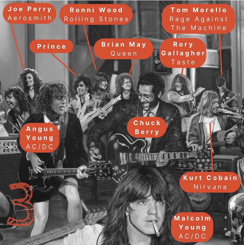 Each guitarist has left an indelible mark on the music industry, influencing countless artists and shaping the sound of blues, rock and heavy metal music. This painting is a tribute to the guitar gods that have soundtracked so many of our shared life memories and experiences.